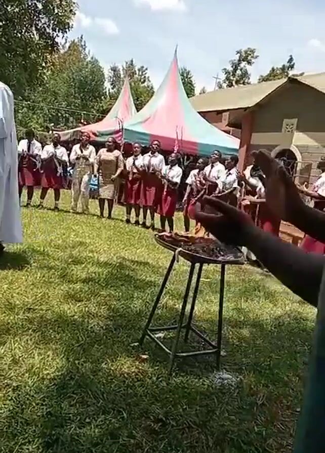 ceremony taking place outdoors on a grassy lawn. A man in a white robe, possibly a religious figure, walks past a table with a white cloth and a pot on it. In front of him is a metal stand with burning coals. Behind the table and the stand, a group of young people, predominantly girls, stand in a line. They are wearing white shirts and red skirts, which suggests they may be part of a school choir or dance group. Behind them are several adults. In the background, there are two tents with red, green, and white stripes, along with a building. The overall scene appears to be a formal outdoor event.