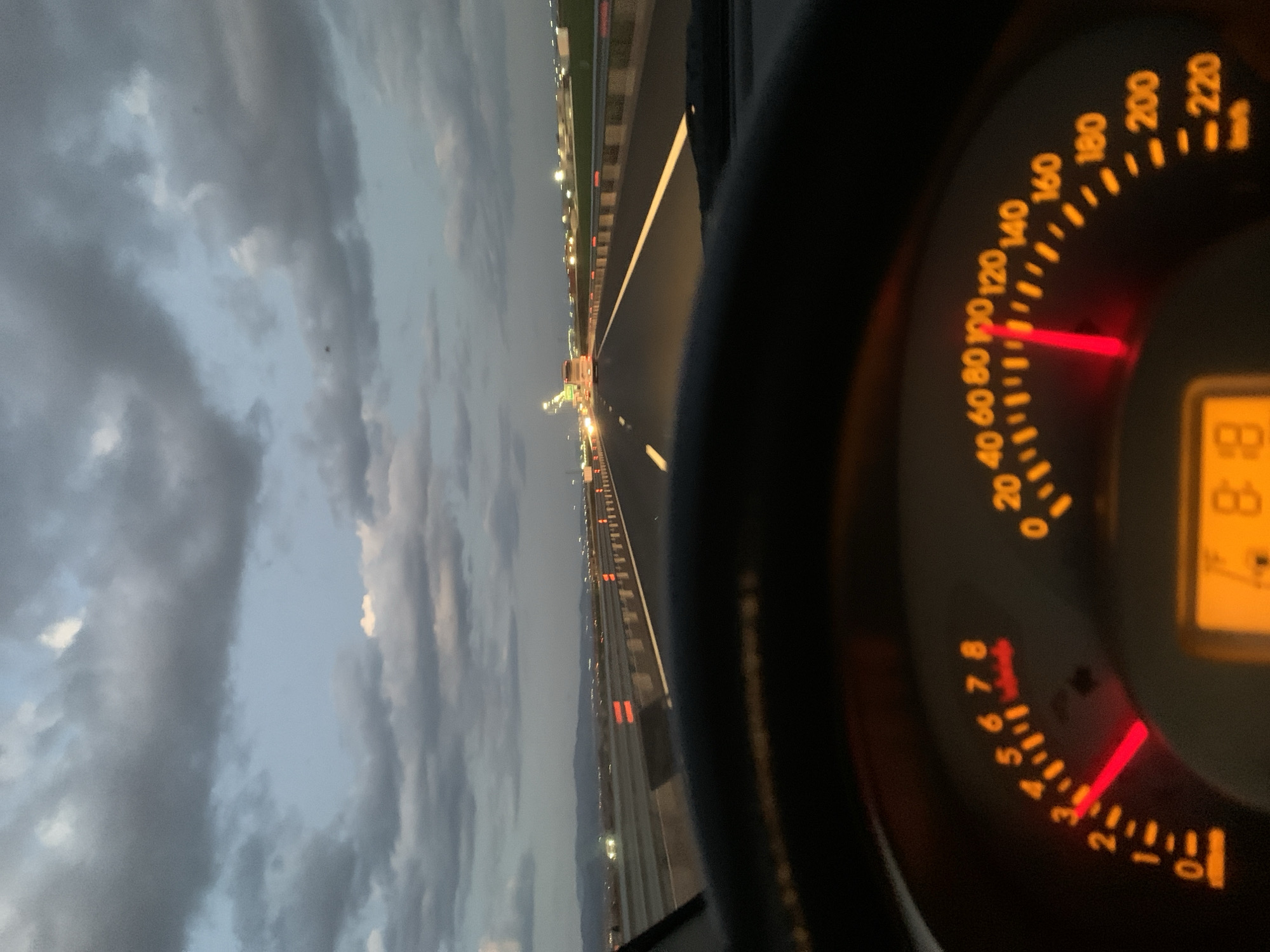 The image depicts the interior of a car driving on a highway. The sky is overcast with grey clouds. The car's speedometer indicates a speed of approximately 100 km/h and the RPM is around 3000. The time displayed is 8:18. The location is Mramor, Bulgaria. Lights from other vehicles and roadside lights are visible on the highway.