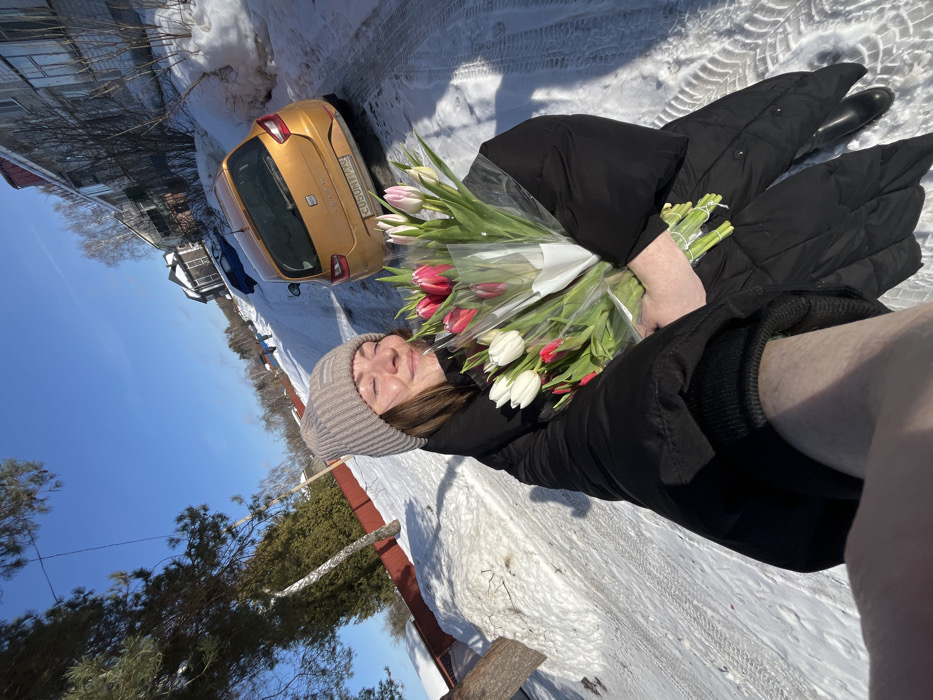 A wide-angle, slightly tilted image depicts a sunny winter day in Раздолье, Russia. In the immediate foreground, the photographer's bare forearm and hand are partially visible on the left. The central subject is an adult female, positioned slightly right of center, wearing a beige knit beanie and a black puffer jacket. Her eyes are closed, and she has a subtle smile, holding a large bouquet of approximately twenty tulips, including white, pink, and red blossoms, wrapped in clear plastic and white paper. Her right foot, encased in a black boot, is visible. The ground is covered in snow, with visible tire tracks on the narrow road or path that extends uphill into the background. To the left, a reddish fence runs alongside the path, backed by pine trees. In the midground, an orange/gold Seat Ibiza hatchback, bearing Russian license plate C050MT770, is parked on the snowy roadside. Several multi-story residential buildings are visible in the background along the street, interspersed with bare deciduous trees. The sky is clear and blue.