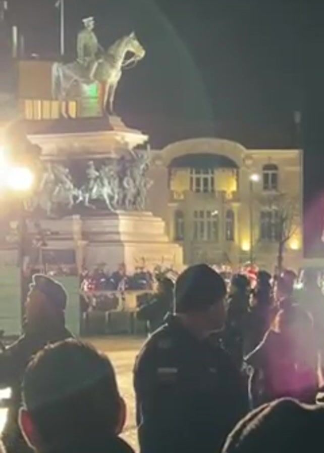 crowd of people gathered at night in front of a large monument of a man on horseback. Many of the people in the foreground appear to be uniformed officers, possibly police or military. Some of them are wearing blue berets and dark jackets. The monument is brightly lit, and there is also a building visible in the background with its windows illuminated. The scene appears to be some sort of public gathering or demonstration. The lighting conditions are dark.