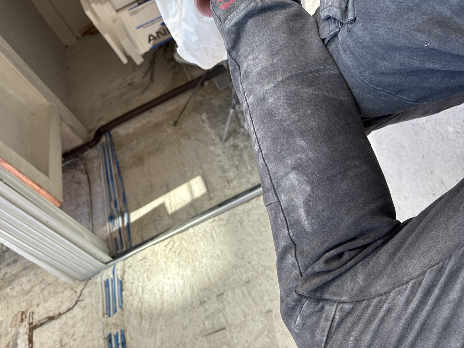 The image displays a ground-level, first-person perspective of a construction or renovation area in Sofia, Bulgaria. In the foreground, the lower legs of an individual wearing dark, dust-covered work trousers are visible, with the left leg crossed over the right. A small red mark is present on the right trouser leg near the ankle. The background features unfinished, light-colored walls with visible cracks and textured surfaces. Horizontal blue conduit lines are surface-mounted on one wall section, while a dark, vertical pipe descends along another. Above, a light-colored, ribbed roll-up shutter is partially open, with a metallic guide rail extending diagonally downwards. Direct sunlight casts distinct rectangular shadows across the rough, light-colored ground and lower wall sections. Construction materials are present, including a white bag with "AN" visible on its side (likely Anhydrite or a similar building material) and stacked white rectangular insulation boards. A heavy-duty power tool, resembling a jackhammer, and a shovel are visible on the ground in the mid-background, leaning against a wall.