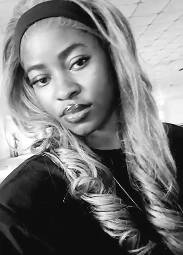 A person with long wavy blonde hair, a black headband, and a dark-colored shirt is the main focus in this black and white video. The person is looking directly at the camera with a neutral expression. They have glossy lips and appear to be wearing jewelry, including a lip ring, a ring on their finger, and a necklace. They briefly raise their hand to their hair. The background is blurry, but there is a glimpse of a ceiling with fixtures.