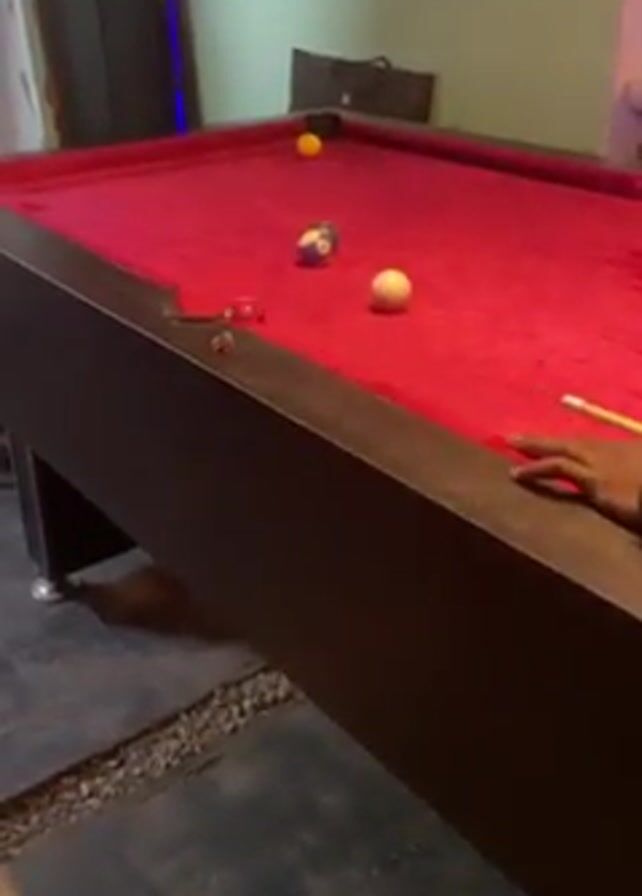 A video shows people playing pool on a red pool table