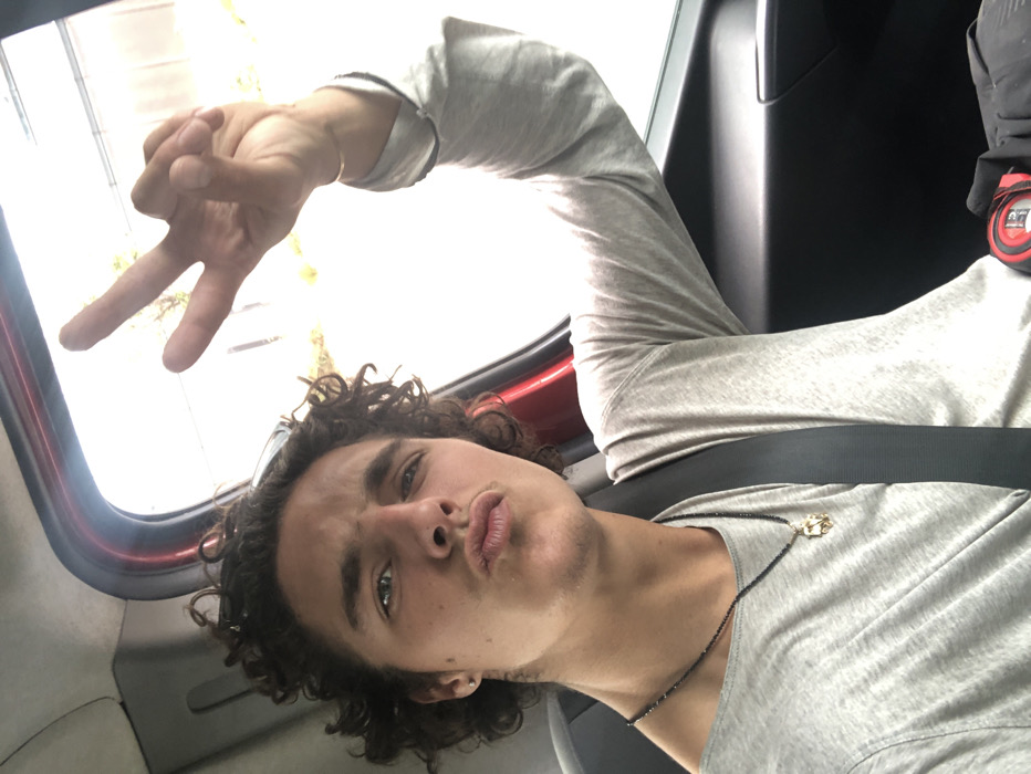 young Caucasian male, estimated to be in his late teens or early twenties, seated in the passenger side of a vehicle in Bezons, France. He has dark, curly hair and light-colored eyes. The subject is wearing a light gray long-sleeved shirt, a black beaded necklace with a small golden, irregularly shaped pendant, and a silver stud earring in his left earlobe. A black seatbelt crosses his chest diagonally. He is looking directly at the camera with a "kissing" face, lips pursed. His right arm is raised, with the hand forming a "V" (peace) sign. A thin gold-colored bracelet is visible on his right wrist. To his right, a red vehicle door frame is visible, and beyond it, a bright, overexposed outdoor scene with vague hints of foliage is seen through the window. A red and black object, consistent with a measuring tape, is partially visible on his right lap, resting on dark fabric.
