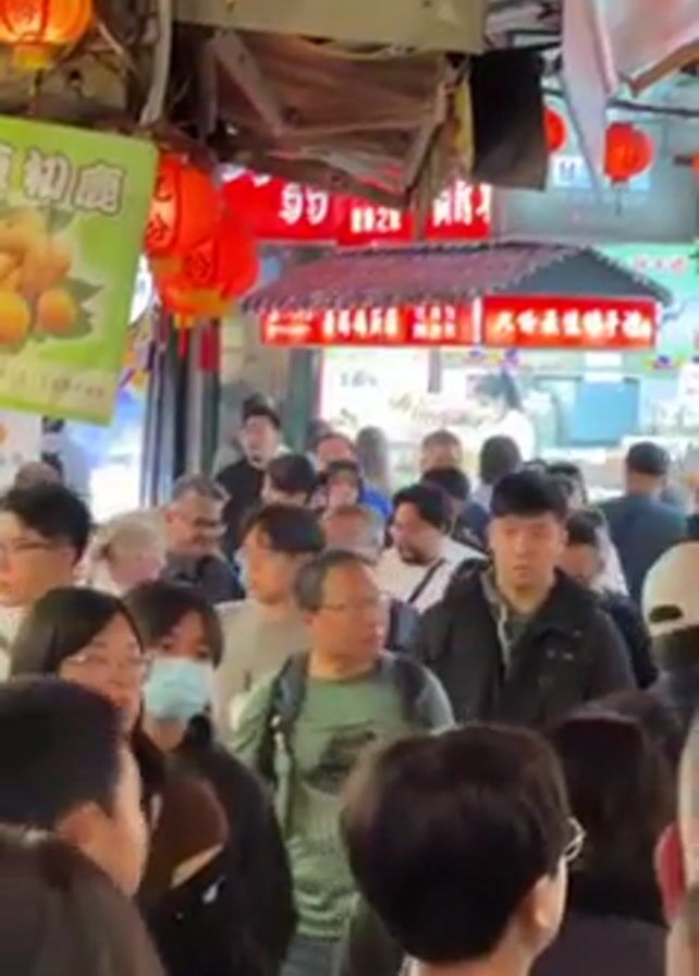 crowded outdoor market scene. A diverse group of people, mostly appearing to be of Asian descent, are walking through a narrow corridor. Many people are wearing glasses and masks. There are red lanterns and commercial signs hanging overhead, indicating a lively, possibly festive atmosphere. The camera is moving with the crowd, capturing the density and bustle of the marketplace.