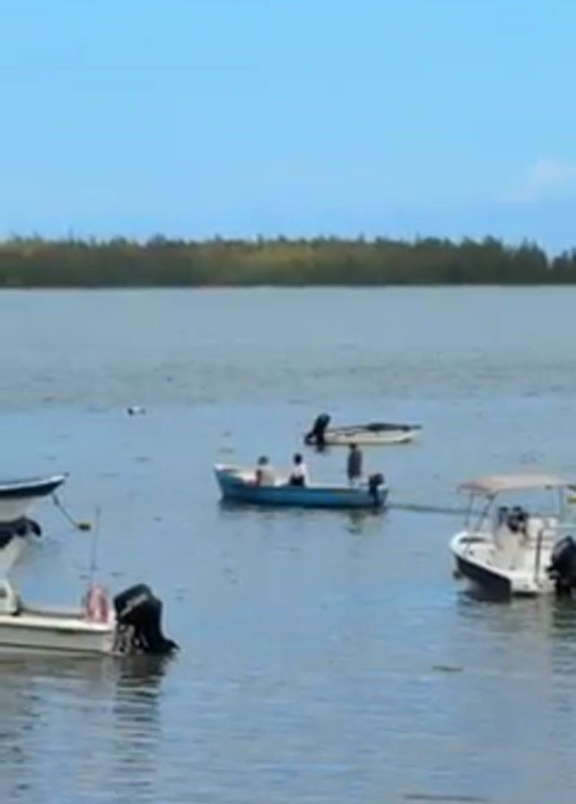 view of a river or bay on a bright, sunny day. A cluster of small motorboats is visible in the water near the shore. Some of the boats are occupied by people. The shoreline is muddy in the foreground. Across the water, there is a line of trees, possibly a forest or a thicket. The sky is clear and blue.