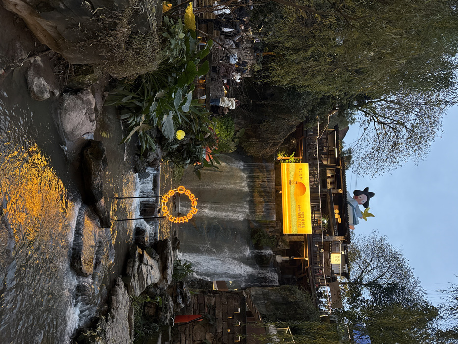 A tranquil waterscape features a tiered waterfall cascading down a rocky slope, illuminated by golden light reflecting on the water's surface. A circular, decorative light structure stands on the left. In the background, buildings with traditional architecture are visible, adorned with illuminated signs and a cartoon character. Lush greenery frames the scene, adding to the natural ambiance. The sky is muted.