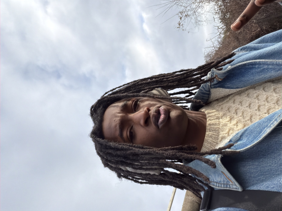A medium close-up image captures an individual of dark complexion with long, dark dreadlocks, situated outdoors in Rosny-sous-Bois, France. The subject is wearing light-colored over-ear headphones, a cream-colored patterned knit sweater, and a light blue denim jacket. A black strap, likely from a bag, is visible over the subject's left shoulder. The individual faces the camera directly, exhibiting a furrowed brow and a slightly puckered mouth. A dark-skinned finger is partially visible in the lower right corner of the frame, pointed upwards and to the left. The background features a cloudy sky with patches of brighter white. To the subject's left, a light-colored, possibly concrete, structural element is partially visible, while to the right, a dense mass of bare, brown branches or bushes is present.