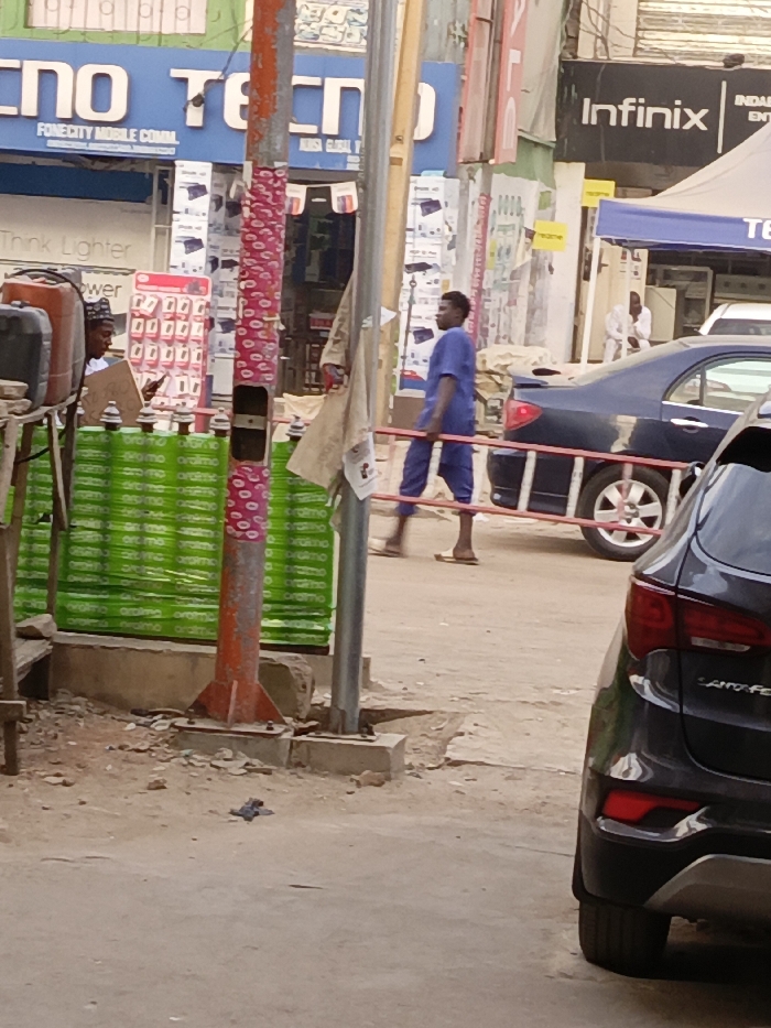 A street scene shows a man in a blue outfit walking past parked cars and various storefronts. The "TECNO" store with blue signage is visible in the background, along with an "Infinix" sign. A man wearing a traditional hat stands near stacked boxes with green wrappers. The ground is uneven, and a pole with red and white wrapping stands prominently in the foreground. A black SUV is partially visible on the right.