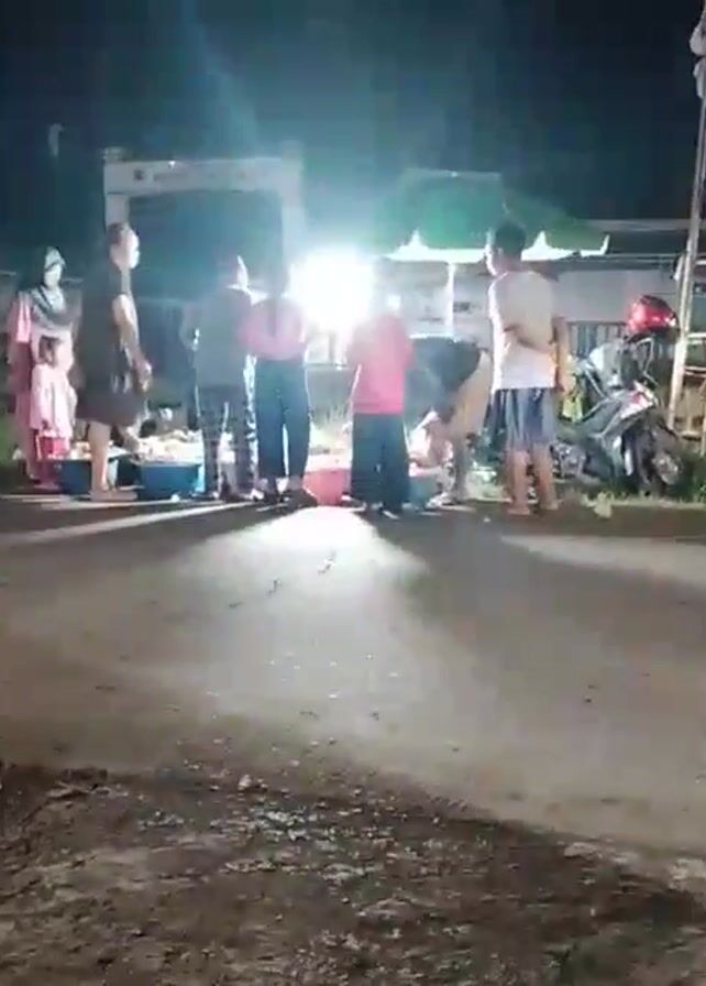 At night, a group of people gather around a vendor's stand on a paved street. The vendor is situated under a green umbrella, with a bright light illuminating the scene. There are buckets, possibly containing merchandise, on the ground in front of the vendor's stand. The group consists of adults and children, with some individuals appearing to be examining the goods on display. A motorcycle is parked nearby. The lighting is stark, with dark shadows contrasting the bright light source. The overall environment suggests an informal, roadside market setting at night.