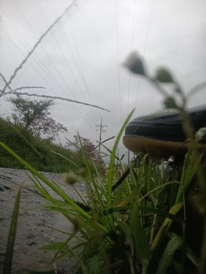 A ground-level view captures a rainy, overcast scene. Green grass blades and fuzzy plants dominate the foreground, some with water droplets. A portion of a black shoe with a brown sole is visible on the right. In the background, a hillside with trees is seen. Power lines stretch across the gray sky, anchored by a utility pole. A concrete surface lies to the left.