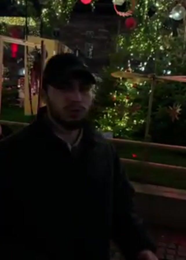 A man wearing a black jacket and black baseball cap turns to face the camera and gestures by raising his middle finger. He is standing on a cobblestone surface, likely a path. Behind him is a large, decorated Christmas tree. There are Christmas market stalls and other decorations visible in the background. The lighting suggests it is nighttime.