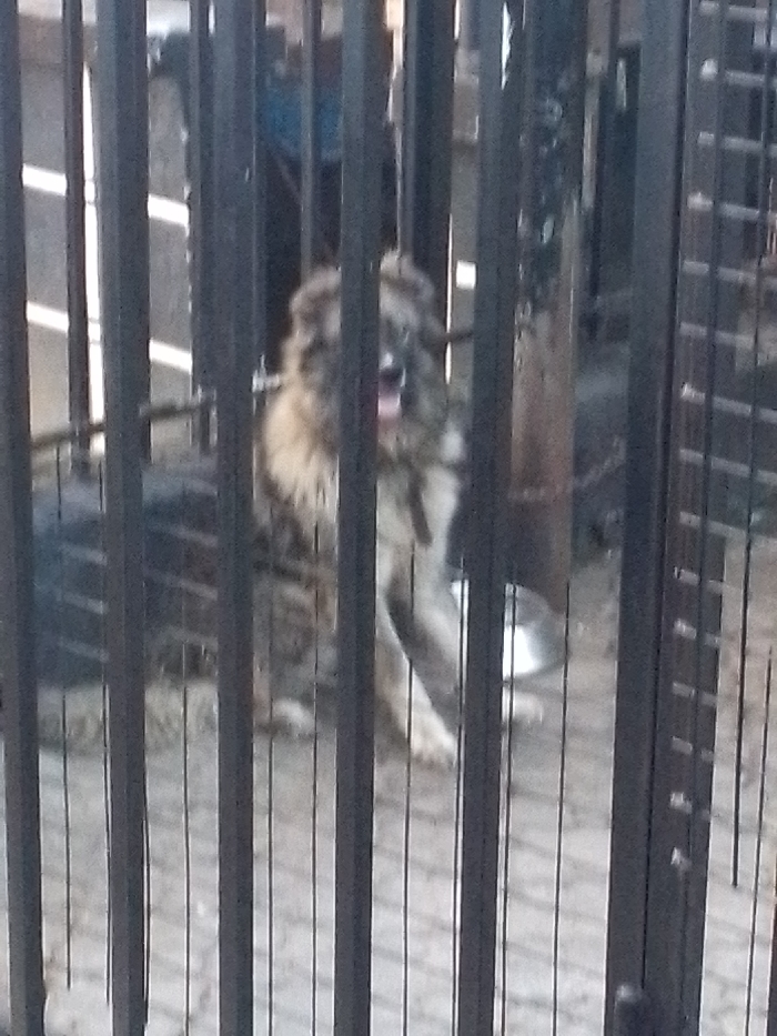 - "A medium-to-large-sized, long-haired dog with tan and dark brown/black fur is partially visible behind dark vertical metal fence bars" by FM-NqVRd2, licensed under CC BY 4.0