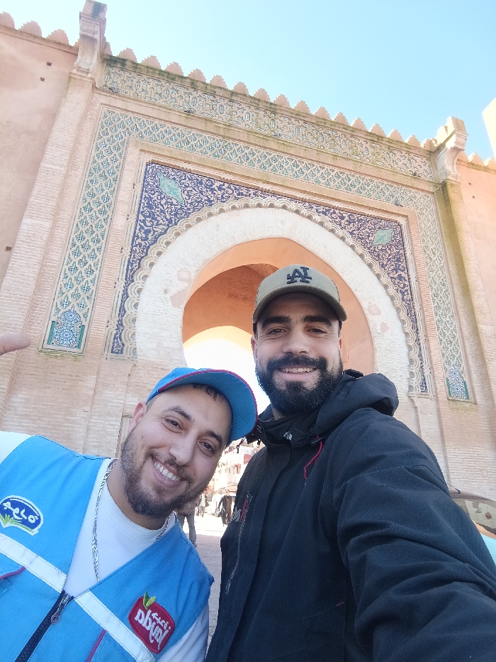 - "A selfie-style photograph captures two adult males smiling, positioned in the foreground before the iconic Bab Mansour gate in Meknes, Morocco" by FM-50aIG2, licensed under CC BY 4.0