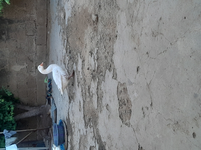 - "A white domestic goose stands upright on a damaged concrete and dirt surface in what appears to be an open yard or courtyard in Hotoro South, Nigeria" by FM-hE1wJ3, licensed under CC BY 4.0
