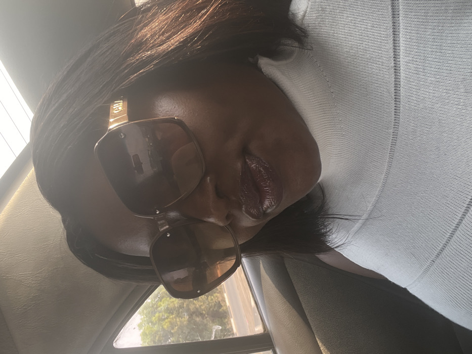 A person with dark skin, dark hair, and full lips accented with dark, glossy lipstick is depicted seated inside a vehicle