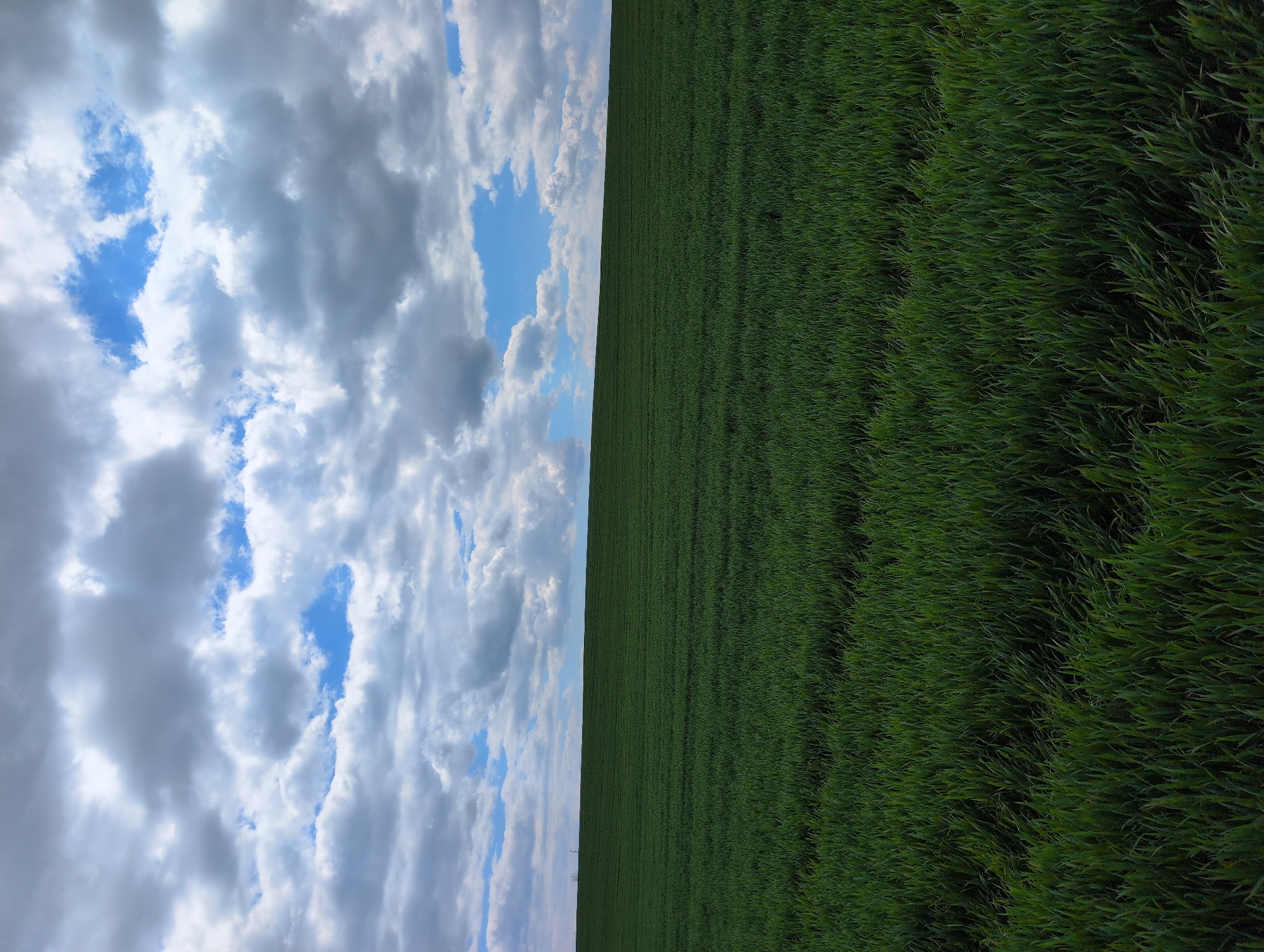 - "A landscape photograph, taken outdoors, shows a field of green grass on the right side and a sky filled with white and gray clouds interspersed with patches of blue sky on the left" by FM-ymUPG2, licensed under CC BY 4.0