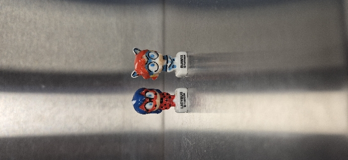 The image displays two small, stylized collectible figurines situated on a horizontal, reflective metallic surface