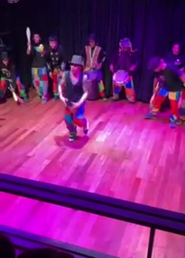 A group of people are performing on a stage. The stage is lit with pink light and has a wooden floor. There is a black curtain behind them. The people are wearing colorful patchwork pants and some are playing drums while others are juggling. One person in the center is breakdancing.