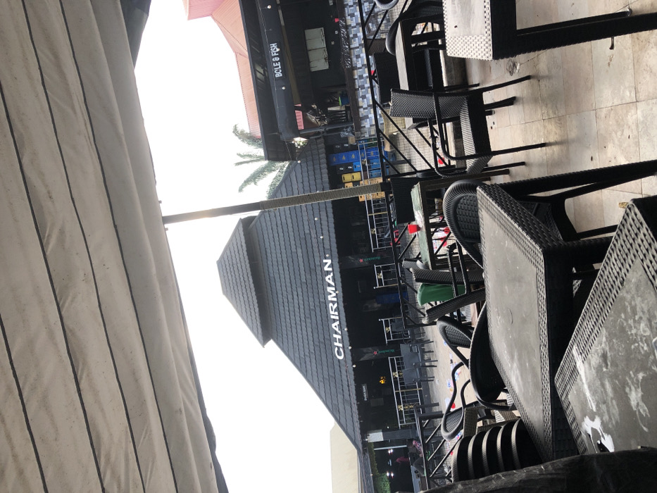 The image depicts the outdoor seating area of Chairman Restaurant and Bole & Fish, located in Awka, Nigeria. In the immediate foreground, an off-white, horizontally striped awning or retractable canopy partially covers the scene. Below this, multiple dark-colored, wicker-style outdoor tables and chairs are arranged on a tiled patio. Several table surfaces exhibit white residue or stains. The midground features an outdoor dining space enclosed by a black metal railing. Within this area, additional dark wicker chairs are scattered, some inverted or askew. A green cylindrical waste bin stands near a table with a red object (possibly an ashtray or small cup). Litter, including plastic cups and wrappers, is visible on the tiled ground. In the background, the primary structure, "Chairman," is a multi-tiered building with a dark, pyramidal roof. The word "CHAIRMAN" is displayed in illuminated white letters across its facade. Below this, "Heineken" logos are visible, indicating a bar or lounge. To the right of the Chairman building, another structure with a dark, flat roof features a sign reading "BOLE & FISH." A few indistinct figures are vaguely visible in the far left background within the establishment. The sky is uniformly bright and overcast. Several palm trees are visible in the distance behind the buildings. No clear human actions or interactions are discernible beyond the apparent arrangement of an outdoor commercial space.