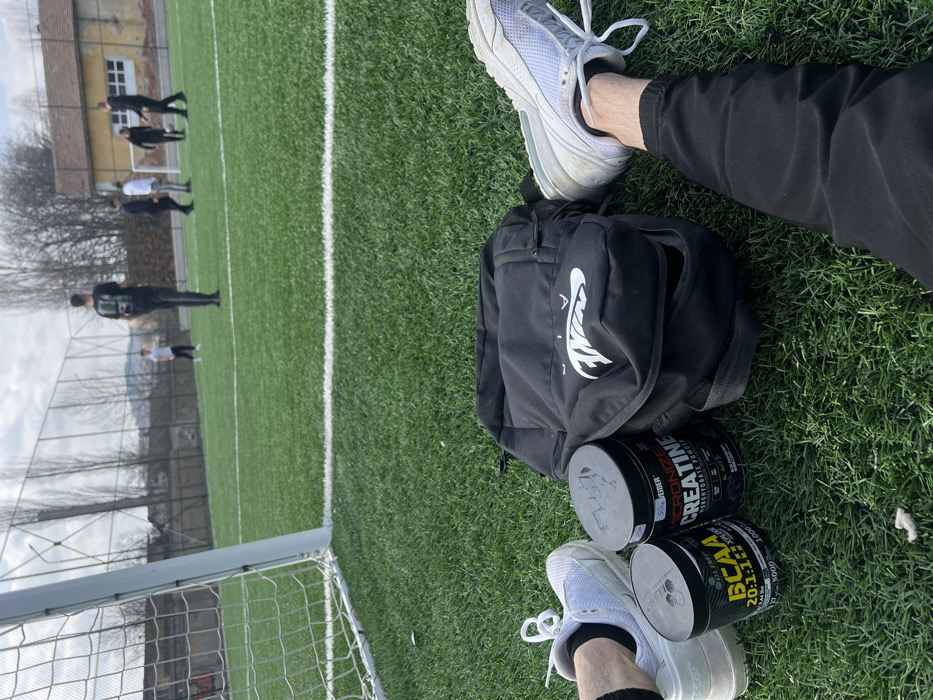 The image displays an artificial turf football pitch located in Kardzhali, Bulgaria, under an overcast sky. In the foreground, a person's lower legs and feet, clad in white athletic shoes and black track pants, are resting on the green artificial grass. Positioned between the feet are a black Nike Air backpack, partially open, and two cylindrical supplement containers. The container on the left is black with yellow and white text, identified as "OLIMP BCAA 20:1:1 XPLODE POWDER." The container on the right is black with red and white text, labeled "EIDER MICRONIZE CREATINE MONOHYDRATE POWDER, Black Raspberry, 500g." In the midground, a white goalpost with netting is visible on the left. Beyond a white field line, approximately six to seven individuals are distributed across the field. Most are casually dressed, suggesting participation in or observation of a football activity. One individual in a black shirt and dark pants stands with their back to the viewer near the center. A small group of individuals is visible towards the right, near what appears to be a smaller, secondary goal. The background features a chain-link fence bordering the pitch, behind which stand leafless deciduous trees. To the far right, a light-colored building with a red-tiled roof is discernible. Faint hills are visible on the distant horizon. The overall scene indicates an outdoor sports facility during daytime.
