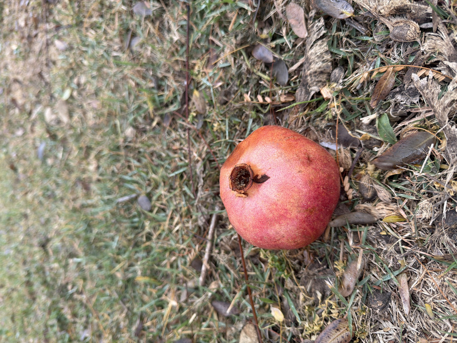 - "A ripe pomegranate rests on a bed of dry grass, leaves, and scattered debris" by FM-grnl23, licensed under CC BY 4.0
