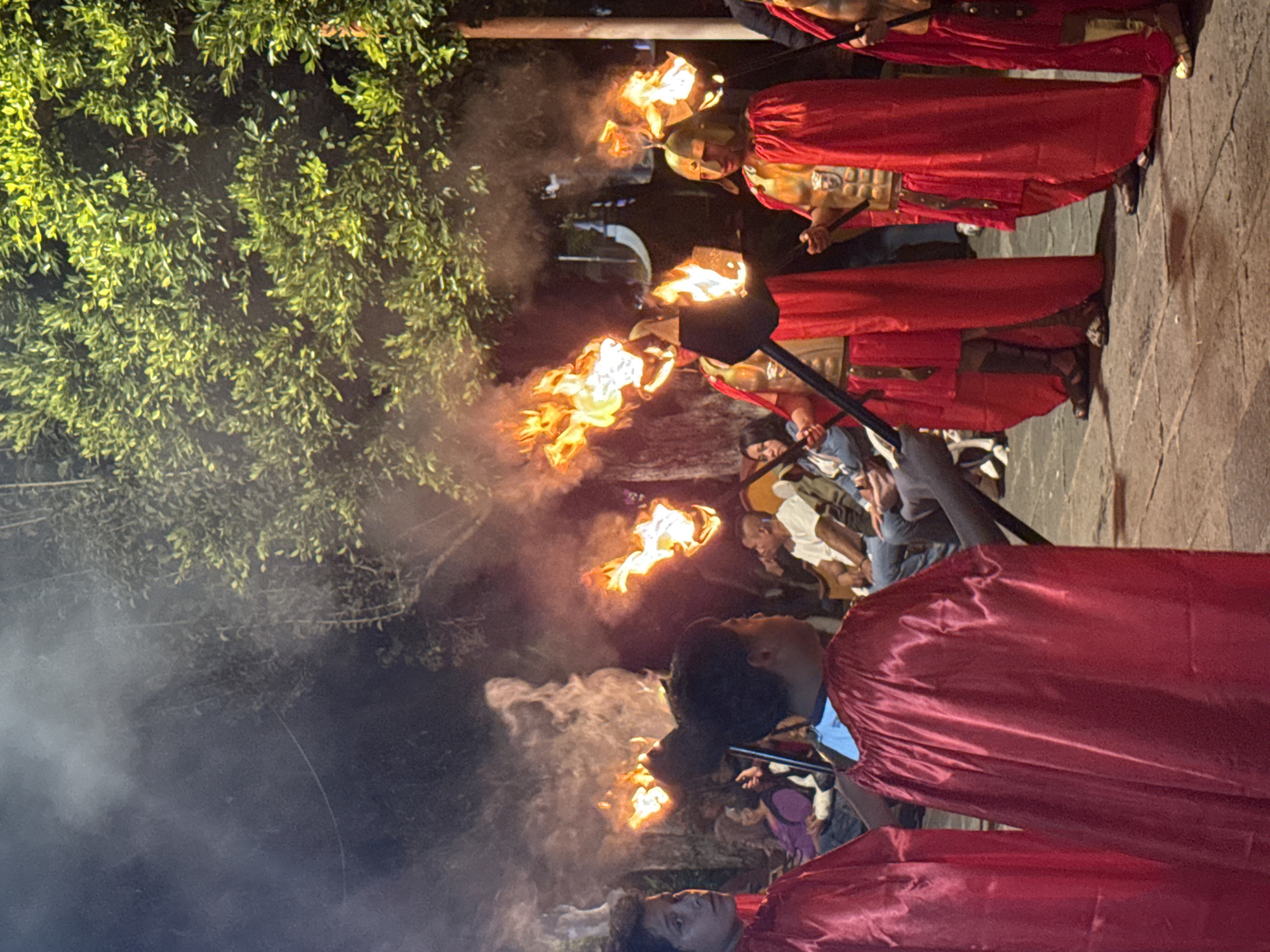 The image depicts a night scene in San Andrés Cholula, Mexico. A group of people dressed as Roman soldiers is walking with torches. The soldiers wear red robes and helmets and are holding long poles with flames at the end. The background features a stone pathway and buildings, with spectators watching the procession. Smoke from the torches fills the air. The image is rotated 90 degrees counterclockwise.