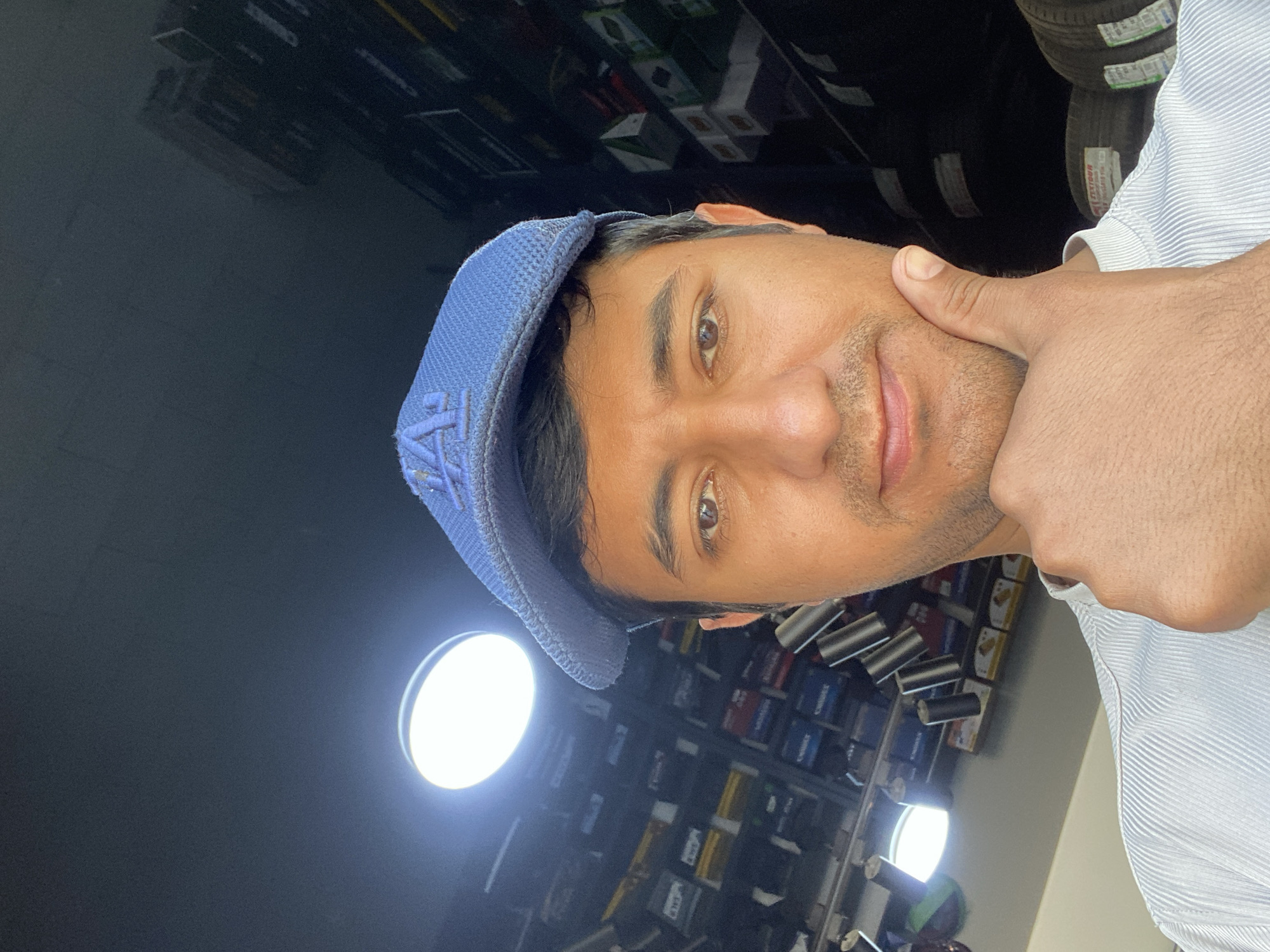 A man with medium brown skin and dark hair is wearing a blue baseball cap with an embroidered logo. He is wearing a light blue button-down shirt. He is touching his face with his right hand. The background consists of shelves stacked with various items and two bright lights. Based on available information, the location is an automotive shop in Bukhara, Uzbekistan.