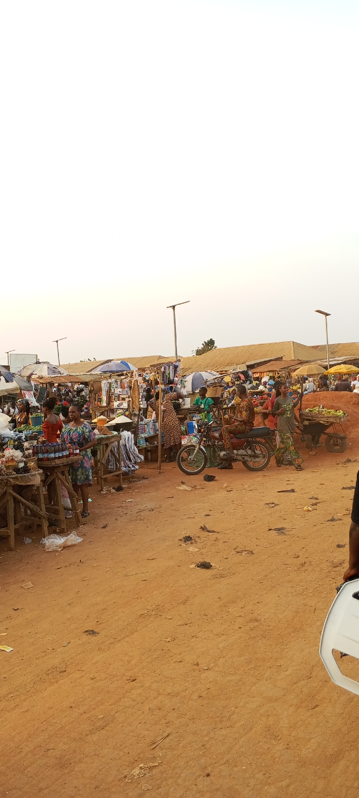 A bustling outdoor market scene under a pale sky. Vendors display goods from wooden stalls and carts. People gather, some in colorful patterned dresses. A motorcycle sits amidst the activity. The ground is dusty and worn. Overhead, solar-powered streetlights stand tall. Roofs of nearby buildings peek from behind the crowded stalls.