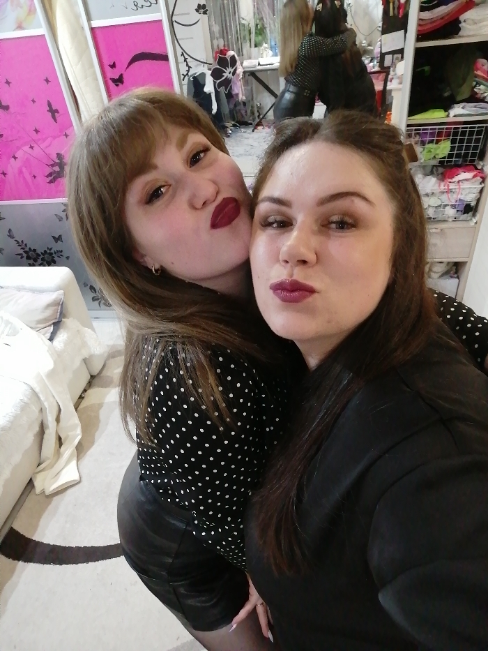 The image captures two adult females posing closely for a selfie inside what appears to be a residential or private room in Chaikovsky, Russia; a specific address or public location is not discernible