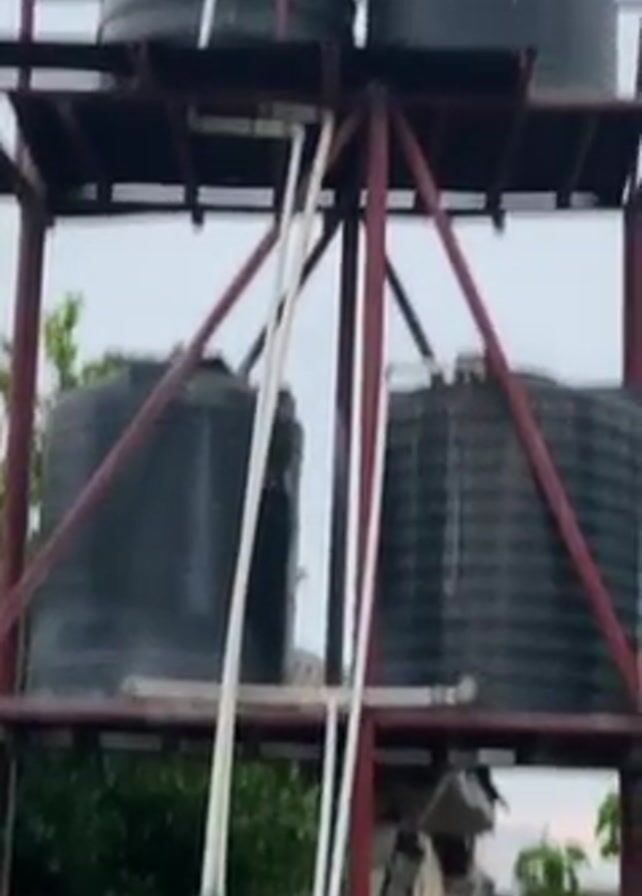 water tank system consisting of four black plastic water tanks. Two tanks are positioned on an upper level, supported by a red metal frame. On top of these upper tanks are several pigeons. Two additional tanks are situated on a lower level, also supported by the red metal frame. White plastic pipes connect the tanks. Behind the tanks is a wall with a few houses partially visible. The sky is overcast. The camera is positioned low, looking up at the structure. There's some green vegetation in the foreground.