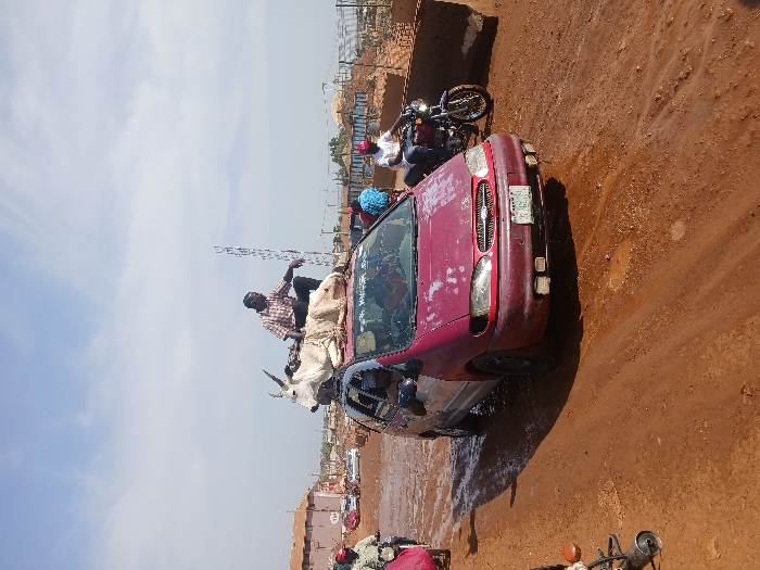 A red car is on a reddish-brown dirt road. There's a man sitting on top of the car next to a cow. A motorcycle is parked beside the car. The sky is partly cloudy. Buildings and construction are visible in the background.