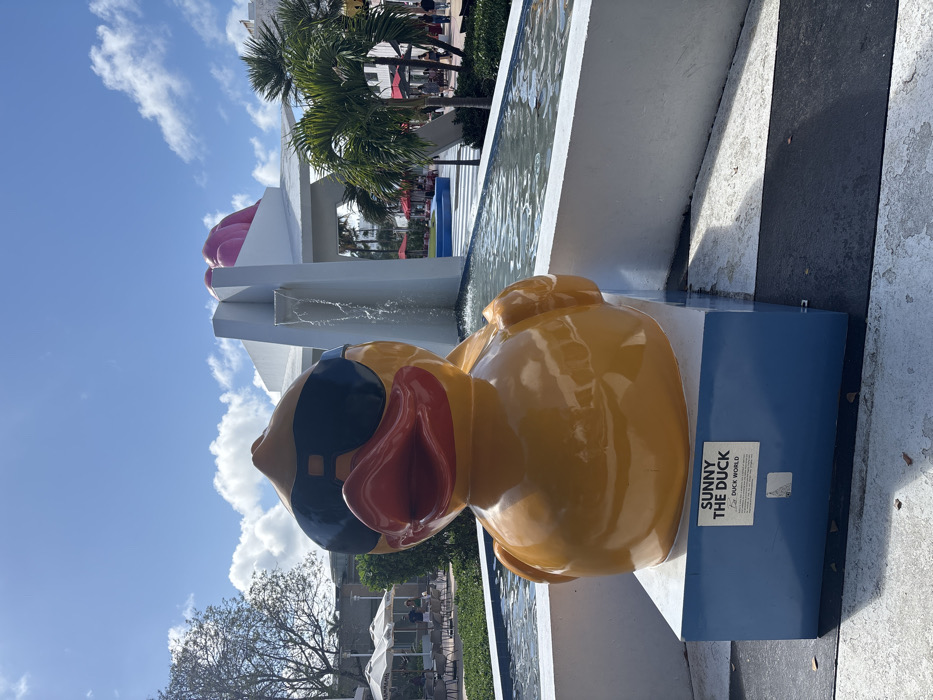 A large, glossy yellow statue of a rubber duck, featuring black sunglasses and a red beak, is positioned centrally in the foreground. It rests on a blue and white rectangular pedestal, which displays a white label reading "SUNNY THE DUCK" and "L for DUCK WORLD." Behind the statue, a white, multi-tiered structure serves as a fountain, from which water cascades into a rectangular pool. The ground in front of the pedestal exhibits a worn black and white checkerboard pattern. In the mid-ground to the left, an outdoor dining area with white umbrellas and tables is visible, with several indistinct individuals seated. To the right and in the background, a path is lined with palm trees and further outdoor seating featuring red umbrellas. Prominent white architectural structures, including a building with distinctive pink, rounded elements on its roof, are visible in the background. The scene is illuminated by bright daylight under a blue sky with scattered white clouds. This location is identified as the Lincoln Road Mall in Miami Beach, United States of America.