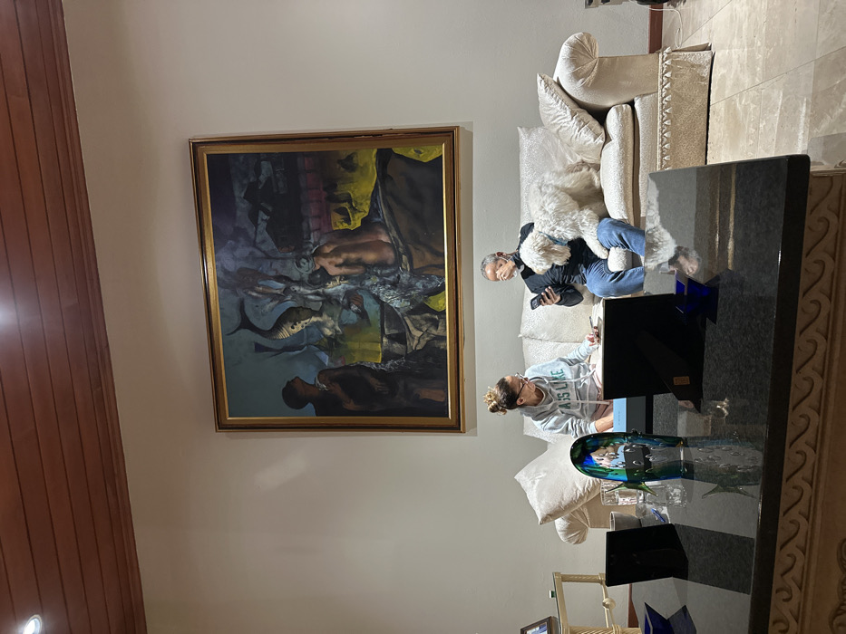 A large framed painting adorns a wall above a plush sofa. Two people are seated on the sofa, one with a white dog on their lap, the other looking at a laptop. A dark, polished table stands in front of the sofa, decorated with glass art and picture frames. The wall is light-colored, contrasting with the darker wooden paneling on the left side of the frame and the tiled floor on the right.