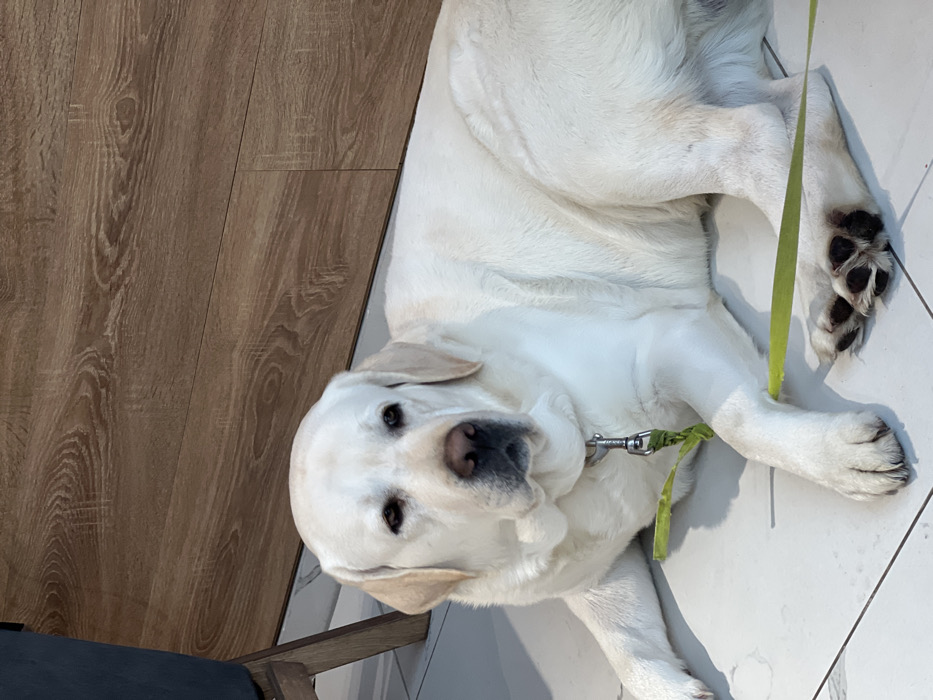 - "A cream-colored Labrador Retriever is lying prone on a light-colored tiled floor with dark grout lines, situated indoors in Mytishchi, Russia" by FM-Vgo2F2, licensed under CC BY 4.0