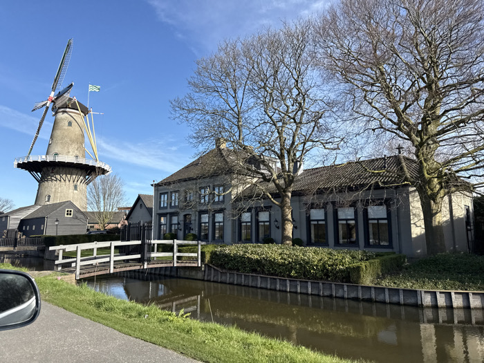 The scene depicts a street-level view of Molen de Hoop (The Hope Mill) and adjacent historical buildings in Wateringen, Netherlands, under clear daylight