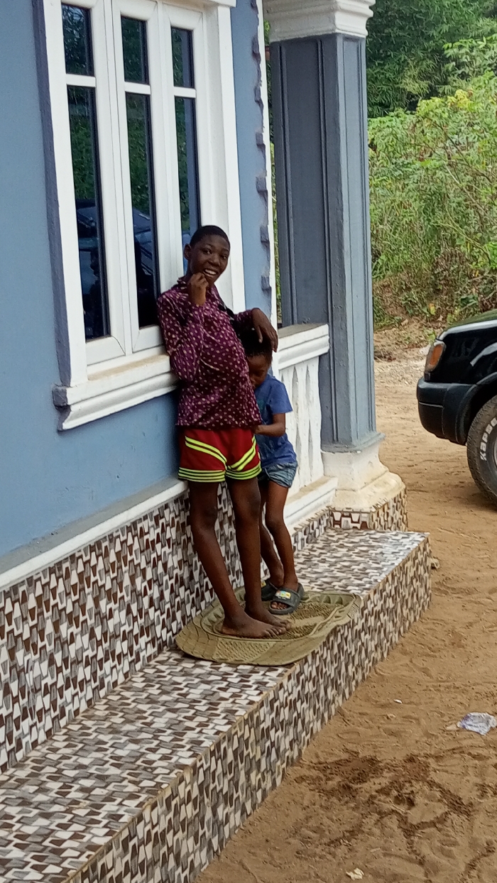 Two children stand on a tiled porch. One child, taller, wears a purple polka dot shirt and red shorts with yellow stripes, leaning against the blue exterior wall. A smaller child, in a blue shirt and shorts, stands beside them, partially obscured. A mat rests on the porch step. Behind them are a house pillar and the front of a black SUV. The background features green foliage.