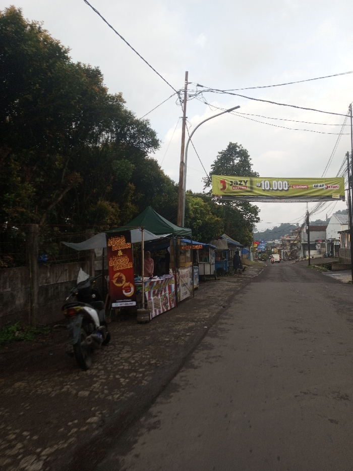 This image depicts a street scene, consistent with an urban or semi-urban area in Indonesia, based on prominent signage displaying Indonesian text and currency, rather than Tangsibi, Bhutan