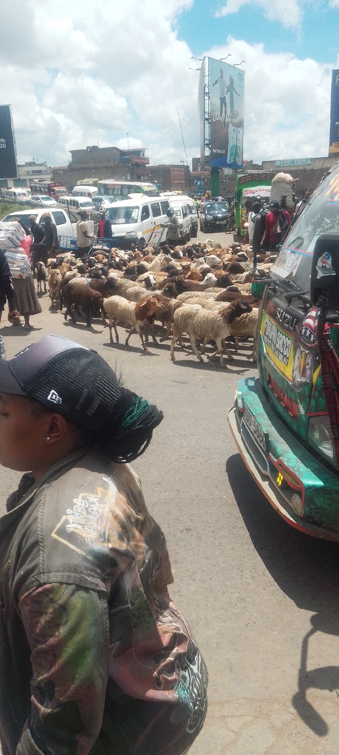 The image depicts a bustling street scene in Nairobi, Kenya, specifically at the Gikomba Market/Machakos Country Bus Station area. Under a partly cloudy sky, a wide paved road is occupied by a large, dense flock of approximately 50-70 sheep of various colors (white, brown, black, tan), moving from left to right across the roadway. In the immediate foreground, to the left, the upper torso of a person is visible from the side and rear. This individual wears a black trucker-style baseball cap with a white emblem, and their dark hair is styled in braids, with some strands featuring a teal/green hue. They are clad in a dark, possibly olive-green, jacket adorned with prominent graphic designs, including what appears to be a stylized animal (possibly a tiger) and white text. A single silver stud earring is visible on their left earlobe. To the right in the foreground, the front-left portion of a heavily customized light blue-green public transport minibus (matatu) is partially visible. This vehicle features a colorful paint scheme with red, yellow, and black accents, including an American flag decal and text such as "ISUZU" and "SOCCOR". Its license plate, "KBU 588R", is partially legible on the bumper. The midground is dominated by the sheep, which impede the flow of several parked or slowly moving vehicles, including multiple white minibuses, a red truck, and other cars. Numerous pedestrians are interspersed among the vehicles and sheep; one person on the left carries a tall stack of wrapped items on their head, while another near the white minibuses pushes a handcart. In the background, a dense urban environment features multi-story buildings, some appearing aged, lining the road. Two large billboards are prominent: one on the far right advertises "Fresha Pura Milk" with the slogan "Let's up your life" and images of people and milk cartons. Another partially visible billboard on the far left displays dark text against a light background. Additional vehicles, including buses and matatus, are visible further down the congested road.