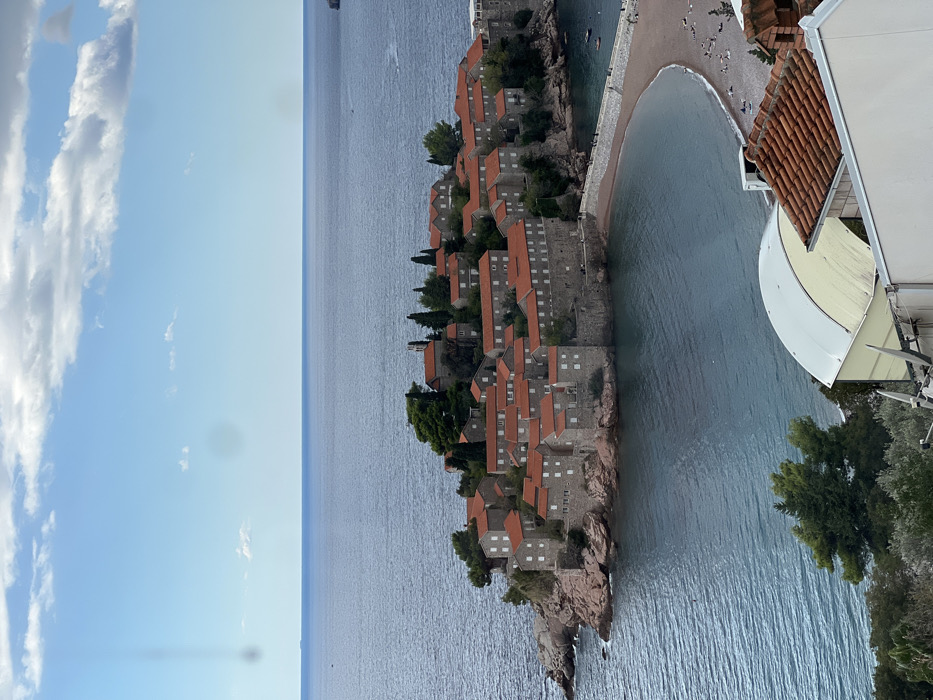 - "An elevated, wide-angle photograph captures the island village of Sveti Stefan, Montenegro, under a partly cloudy sky" by FM-PcEqo1, licensed under CC BY 4.0
