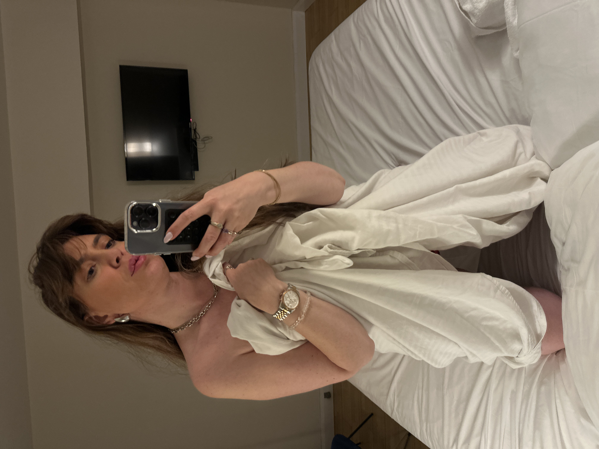 A woman is in a hotel room, likely in Batumi, Georgia, based on common hotel layouts. She is lying in a bed with white linens, partially covered by a sheet. She is holding a smartphone and taking a selfie. There's a TV on the wall and standard hotel room decor.