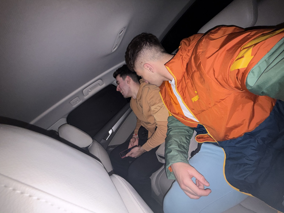 The image depicts the interior of a vehicle, specifically the rear passenger compartment, at night. No external landmarks identifying a location within Haskovo, Bulgaria, are discernible. Two adult males are visible. In the immediate foreground, the right shoulder, arm, and head of a male individual are present. He wears a multi-colored puffer jacket featuring prominent orange sections, green sleeves, and navy blue lower portions, with a visible white stripe and yellow Puma branding on the orange chest area. His head is turned slightly away from the camera, looking towards the right side of the vehicle. His right arm rests on his light blue-clad thigh. Behind and to the left of the foreground individual, a second male is observed reclining in the back seat. He is wearing a tan-colored hoodie and dark trousers. His head is tilted back, his mouth is open, indicating laughter or speech, and his gaze is directed upwards and to the right. He holds a mobile phone with a red case in both hands, positioned near his lap. The vehicle's interior features light-colored, possibly white or off-white, leather or fabric upholstery on the seats and ceiling. A dark exterior is visible through the vehicle's windows, consistent with nighttime conditions.