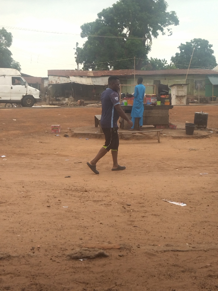 dirt road in Asuir, Nigeria, with a man in a blue and black shirt and black shorts walking away from the camera