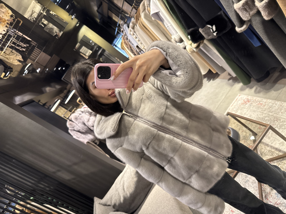 The image displays a mirror selfie of a female subject within a retail establishment in Zeytinburnu, Turkey. The subject wears a light grey, horizontally paneled fur jacket with a central zipper and fur cuffs, paired with dark trousers. She holds a pink smartphone with her right hand, capturing her reflection. The background, viewed through the mirror, reveals an interior consistent with a fur or coat store. Visible elements include a grey upholstered couch, a patterned rug, a glass coffee table, and multiple racks displaying various coats and garments in diverse colors. Overhead, the reflective ceiling shows lighting fixtures and structural components of the room.