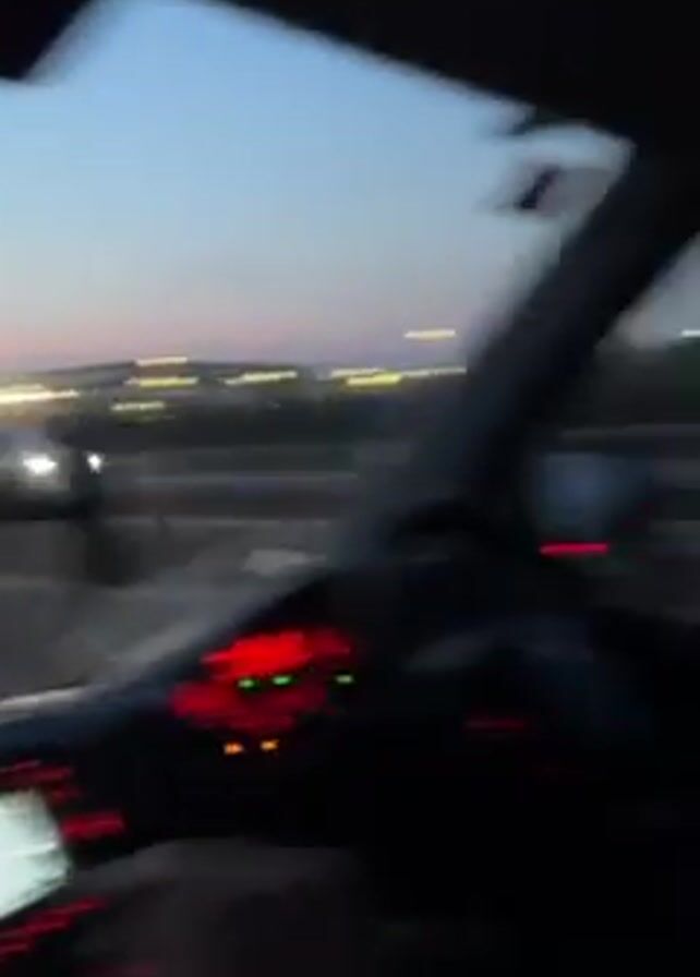 car driving on a highway at twilight, with a pink and blue sky visible in the background. The camera is inside the car, pointing out the front windshield. Other cars are visible on the highway, and there are trees lining the side of the road. The interior of the car is dark, but the dashboard and part of the driver can be seen. The driver is turned to the left, and then returns to face the front. Music is playing. The video continues, showing the highway, sky and the car's windshield wipers.