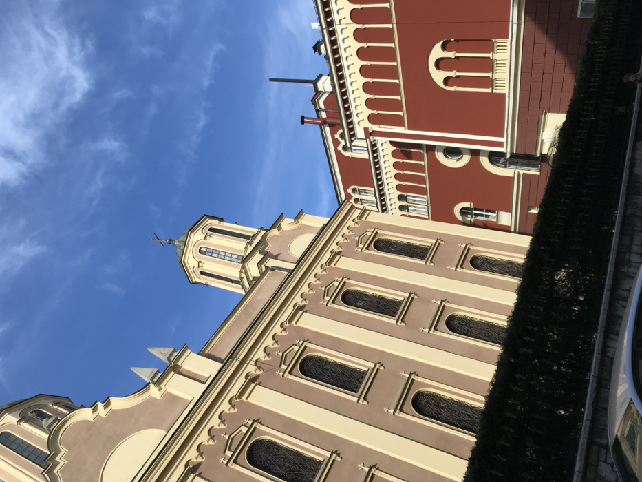 The image displays an upward, diagonally angled view of two prominent historical buildings in Sarajevo, Bosnia and Herzegovina, set against a clear blue sky with sparse, wispy clouds. On the left, partially framed, is the Cathedral Church of the Nativity of the Theotokos, recognizable by its light brownish-pink facade contrasted with cream-colored architectural trim. The church features multiple tall, arched windows fitted with dark grilles. A central octagonal bell tower, topped with a green dome and a Christian cross, is prominently visible against the sky, along with a segment of another dome on the far left. Adjacent to the church on the right stands the Faculty of Law building, distinguished by its deep red exterior walls and white decorative elements. This building exhibits multiple arched colonnades and various window shapes, including circular and arched openings, some with small balconies. In the immediate foreground, a dark green, manicured hedge runs horizontally across the lower portion of the image, partially obscuring the base of the buildings. The roof of a silver-colored vehicle is visible in the bottom-left corner, positioned beneath the hedge. The scene is brightly lit by direct sunlight, indicating daytime conditions. These structures are specifically located on Obala Kulina Bana street in central Sarajevo.