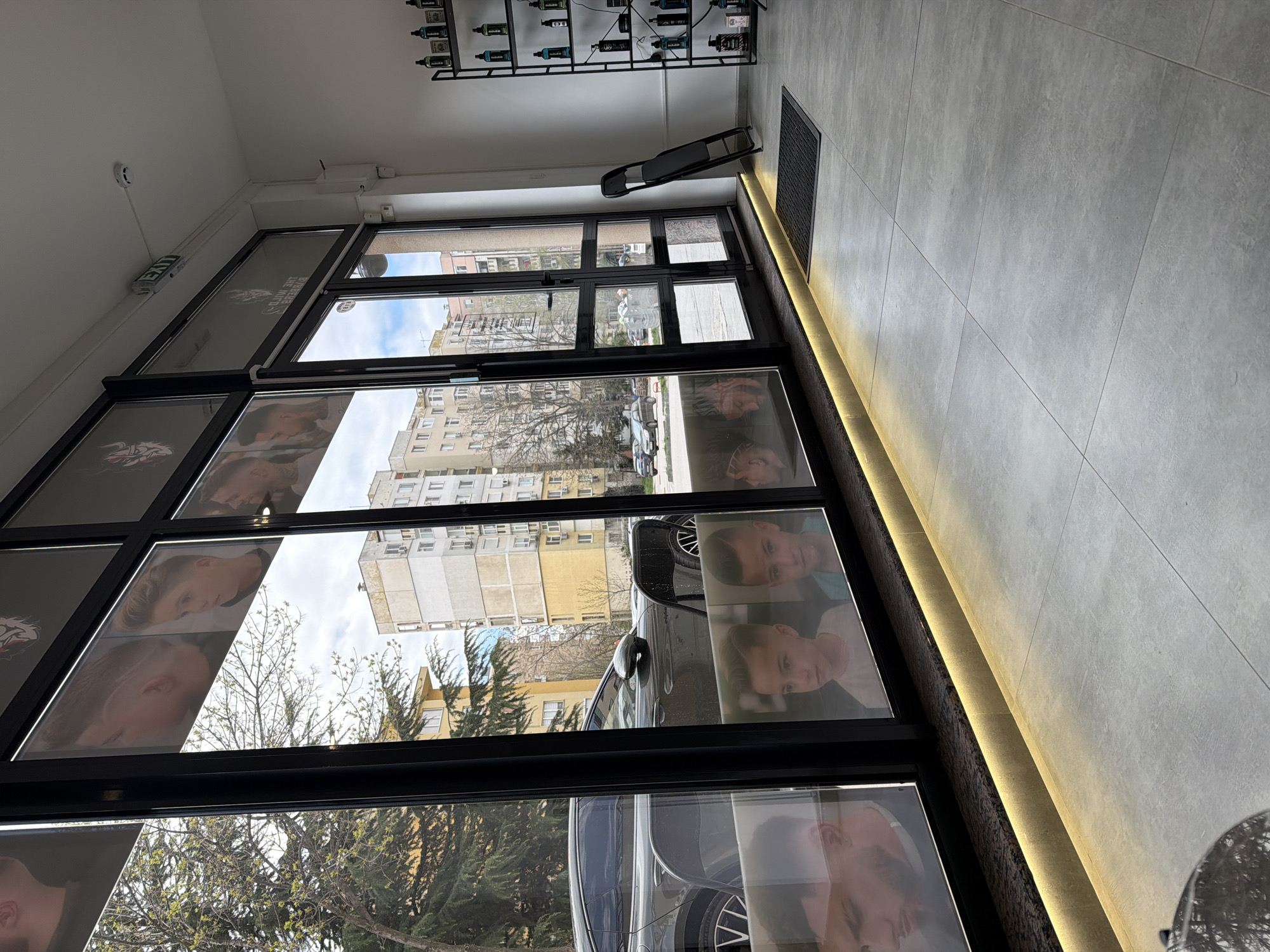The image depicts an interior view of a barbershop, likely located in Plovdiv, Bulgaria based on the architecture visible through the window. The barbershop features a large storefront window with panes displaying male portraits. The exterior view through the window shows an urban landscape with apartment buildings, trees, and parked cars. The interior has gray tiled flooring and a shelving unit displaying hair-care products. A chair and a doormat are visible. The lighting is a combination of natural light from the window and artificial lighting. The interior decor features a lighting strip along the bottom of the window frame. No people are directly visible within the barbershop itself, but the exterior view shows people in the distance.