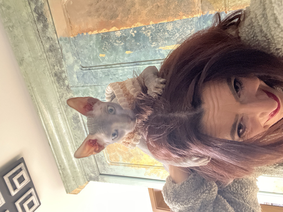 The scene depicts an adult female indoors in Konz, Germany, with a Sphynx cat perched on her head