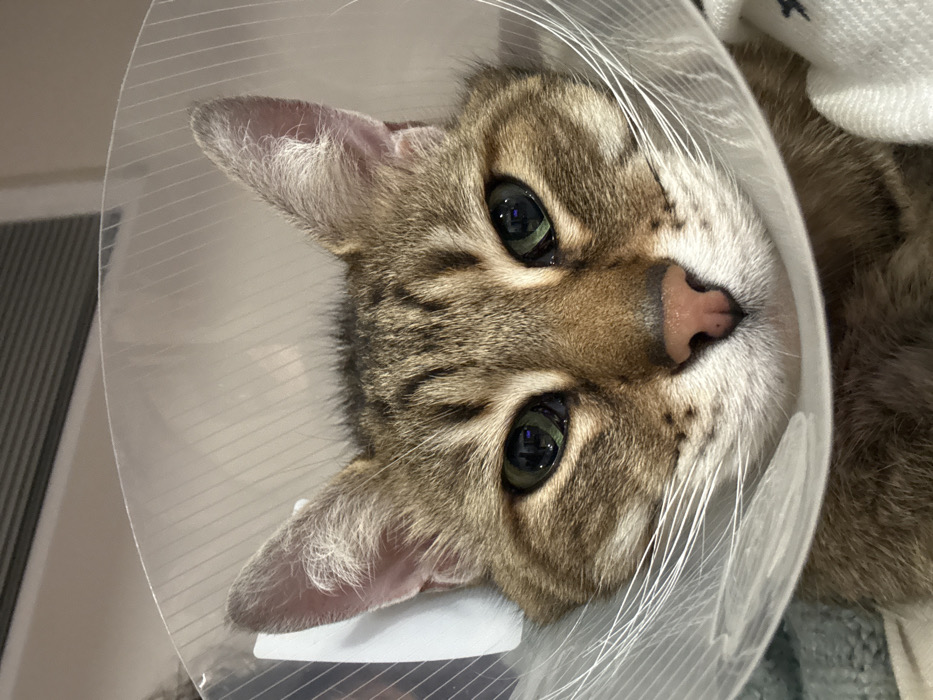 - "A domestic tabby cat, exhibiting brown, black, and tan striped fur, is depicted in a close-up, head-on view while wearing a clear plastic Elizabethan collar" by FM-7QNAW2, licensed under CC BY 4.0
