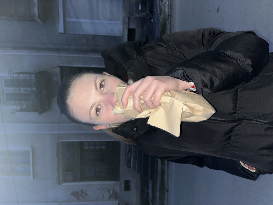 A frontal image depicts a young female subject positioned outdoors in Cherven Bryag, Bulgaria. The subject holds a crumpled, light-brown paper bag to her lower face, obscuring her mouth and nose, suggesting an action of consuming an item from within the bag. Her light-colored eyes exhibit a red-eye effect, and her hair is pulled back. She is dressed in a black, padded puffer jacket. On her left wrist, multiple beaded bracelets are visible, featuring red, white, and pearl-like beads. The background consists of a two-story building with a faded, light-grey facade, indicative of a concrete or stucco finish. The structure exhibits signs of wear and disrepair, including chipped surfaces and exposed underlying material, particularly on the ground floor. Architectural features include rectangular windows with dark frames on both levels, a recessed dark ground-floor entrance, and a small, ornate, dark-colored iron balcony with dark railings on the second floor. The immediate ground level beneath the subject is a flat, dark surface, likely a pavement or street. The scene is illuminated by dim, ambient light, consistent with twilight or nighttime conditions.